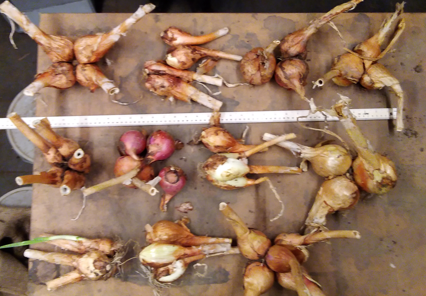 In the 2024 season some of the onions planted from seed ended the season as quite small single bulbs. These were too small to be considered to be viable potato onions and would normally have been culled. However, in the thought that they might split in subsequent years, I replanted them out in 2025 to see what might happen. In fact, some did split. The image below shows the results.